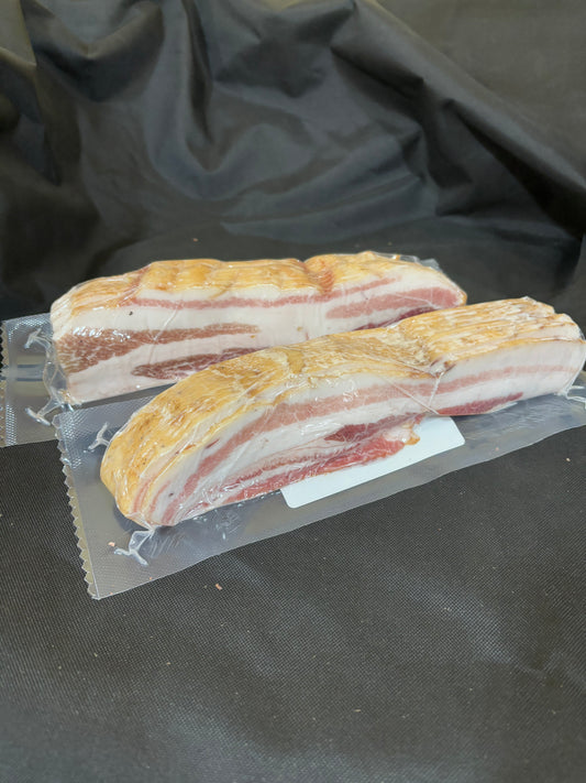 They love to eat roots, bugs, worms, and other things found around them. A pig's diet plays a big role in the outcome of our meat. Pigs will eat pretty much anything you put in front of them, but their diet consists of a high-quality, organic, grain-based diet that consists of corn, wheat, oats, alfalfa meal, bone meal, a swine nutrient supplement, hamate's and kelp, which gives them energy and soybeans and canola meal for protein. NO mRNA vaccines given. A healthy diet for a pig is very critical to producing healthy, nutritious and delicious meat for you to eat. These pigs are never given any type of hormone or antibiotic. Heritage-bred pork is simply delicious. It has a higher fat content throughout the meat, which makes for a rich, deep flavor.